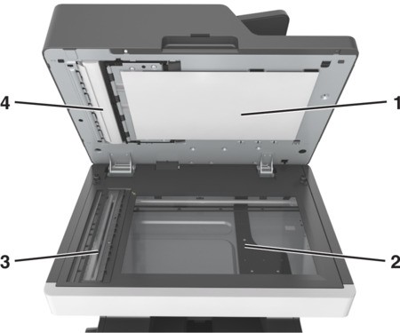 1Крышка сканера с белой нижней стороной2Стекло сканера3Стекло УАПД4Крышка устройства автоматической подачи с белой нижней сторонойЗакройте крышку сканера.