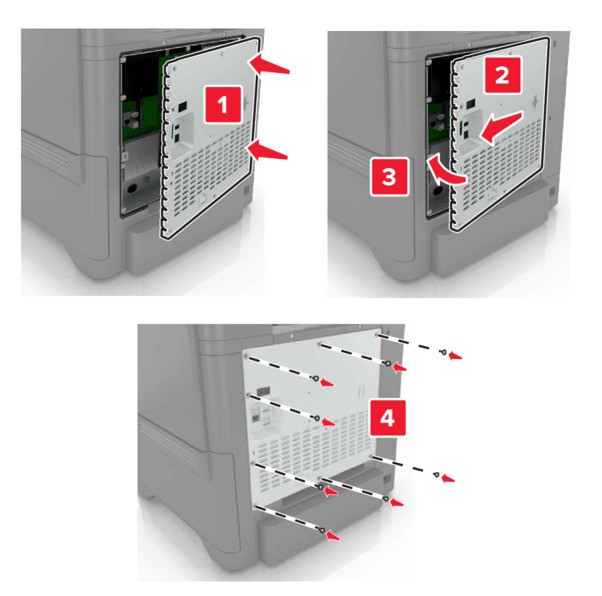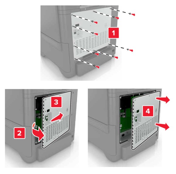 - Выключите принтер, а затем отсоедините кабель питания от розетки.С помощью отвертки с плоским шлицем снимите крышку доступа к плате контроллера.Электронные компоненты платы контроллера могут легко выйти из строя под действием статического электричества. Перед тем как прикоснуться к какому-либо электронному компоненту платы контроллера или разъему, дотроньтесь рукой до какой-нибудь металлической детали принтера.