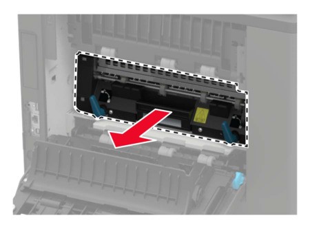 - Откройте дверцу C.Внутренние компоненты принтера могут сильно нагреваться. Для снижения риска получения травмы в результате прикосновения к горячей поверхности подождите, пока поверхность остынет, прежде чем к ней прикасаться.Для предотвращения повреждения от электростатического разряда коснитесь любой открытой металлической части корпуса принтера, прежде чем открыть или дотронуться до внутренних частей принтера.