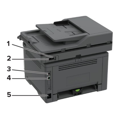 1 | порт EXT Доступен только в некоторых моделях принтеров. | Подключение дополнительных устройств (телефона или автоответчика) к принтеру и телефонной линии. Этот порт используется при отсутствии выделенной линии факса для принтера и только в том случае, если этот способ подключения поддерживается в вашей стране или регионе. |