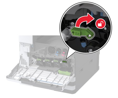 Чтобы избежать высыпания тонера, поставьте блок вертикально.Разблокируйте старый модуль фотопроводника.