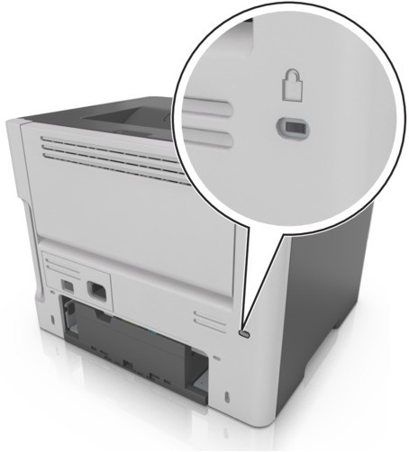 Bu yazıcının bir güvenlik kilidi özelliği vardır. Yazıcıyı güvenceye almak için gösterilen konuma çoğu dizüstü bilgisayarla uyumlu bir güvenlik kilidi takın.