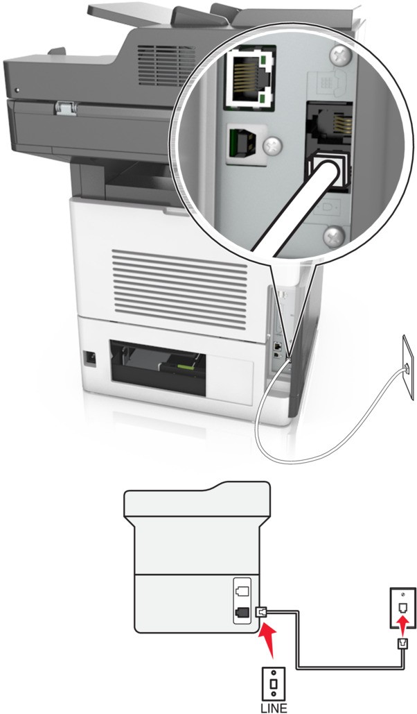 - Telefon kablosunun bir ucunu yazıcının arka tarafındaki hat bağlantı noktasına takın.