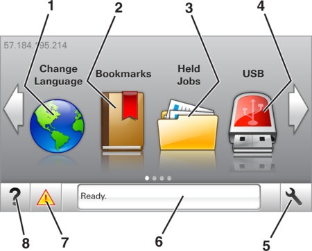 打印机 IP 地址 示例: 123.123.123.123 | 你的打印机的 IP 地址位于主屏幕的左上角,显示为四组用实心句号分隔的数字。在访问 Embedded Web Server 时,你可以使用 IP 地址。这样,即使你不在打印机附近,你也可以查看打印机设置,并进行远程配置。 |