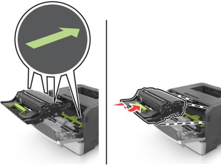 - 将成像单元侧轨上的箭头与打印机内侧轨上的箭头对齐,将成像单元插入打印机。