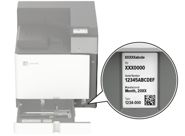 The MTMN is on the label together with the serial number of the printer. The serial number is marked with the field label SN in green. The MTMN is marked with the field label TYPE in blue.